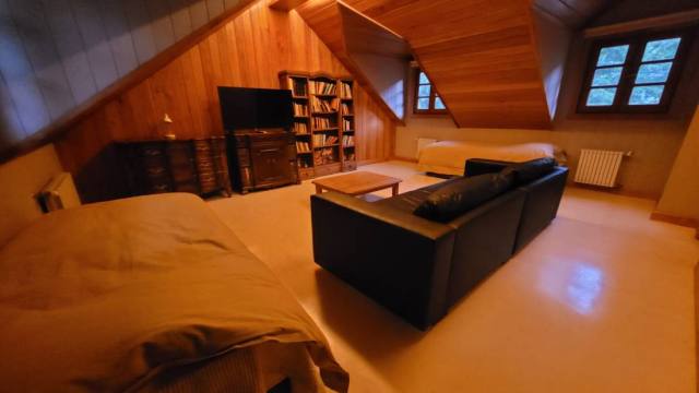 En la planta superior habitación que funciona como sala de estar secundaria o playroom, librería y muebles de tv. Dormitorio con baño en Suite.